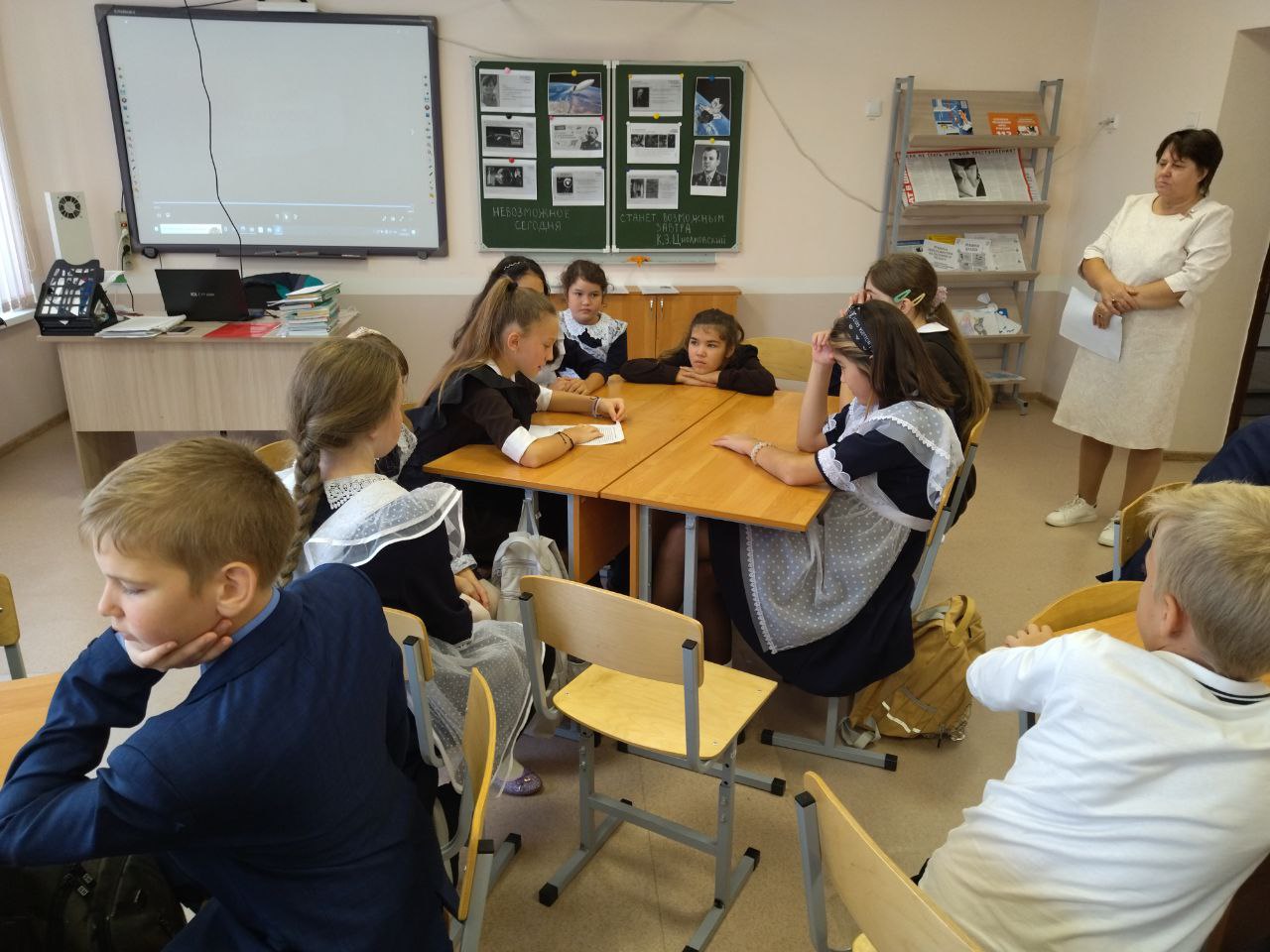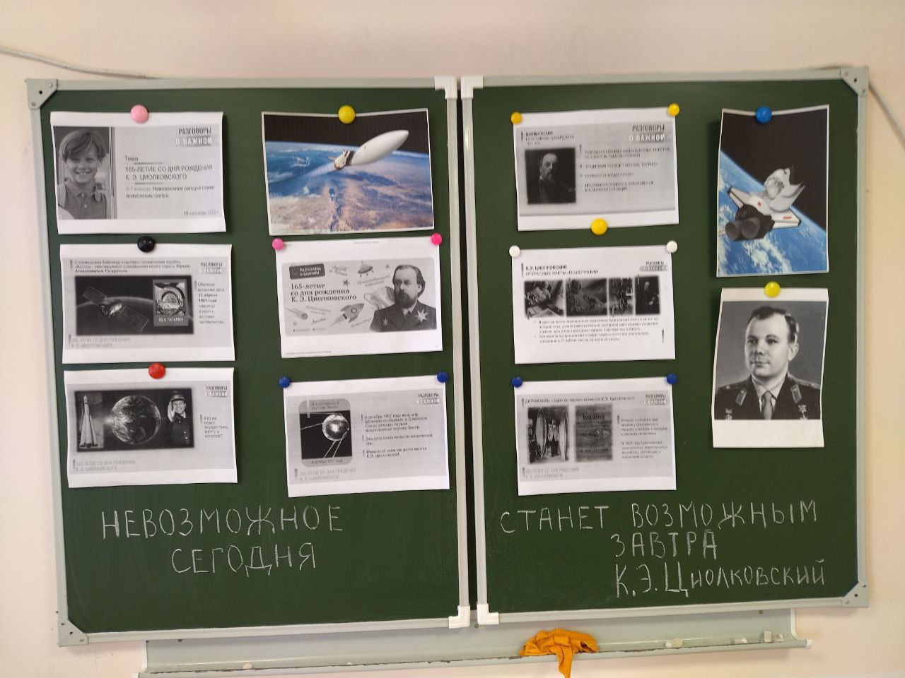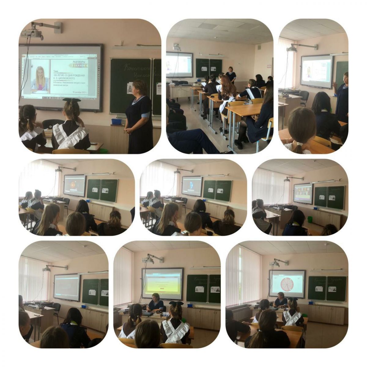 19 сентябрьдә 5-7 сыйныфларда к.Э. Циолковскийның тууына 165 ел тулу уңаеннан «мөһим сөйләшү " дәресе үтте."Интерактив уенда укучылар космик разведка белән бәйле мәгълүматны искә төшерделәр,бу дәреснең максатын ачыкларга мөмкинлек бирде, аннары укучылар Циолковский турында кечкенә видеофрагмент карадылар, соңыннан төркемнәрдә эш оештырылды,анда балалар космосны үзләштерүче геройлары белән якыннанрак таныштылар,хыял һәм батырлык турында әңгәмәдә катнаштылар,әңгәмә ахырында кечкенә генә сөйләшүгә йомгак ясадылар.