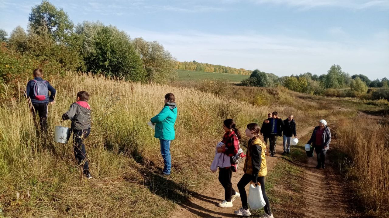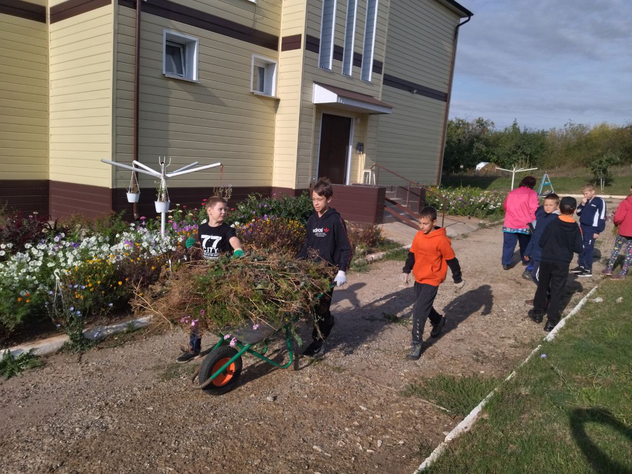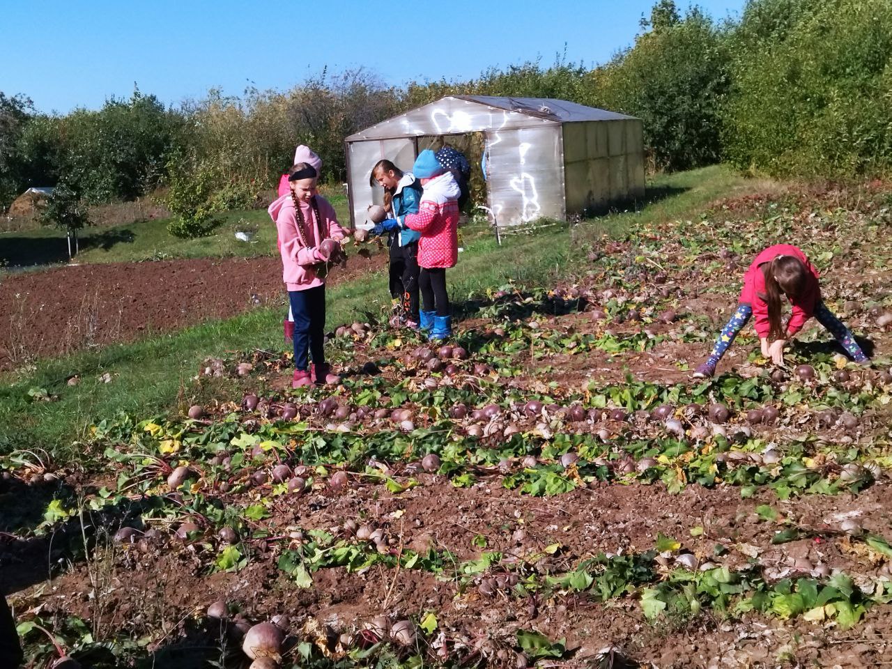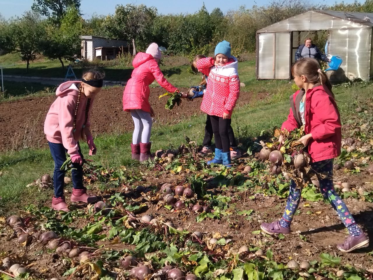 Сентябрьская погода порадовала нас сегодня тёплым солнечным деньком и мы, вооружившись перчатками, вёдрами и вилами, отправились на пришкольный участок, собирать урожай.