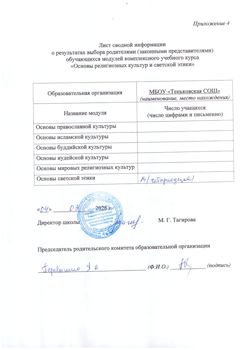 В 4 классе образовательных организаций Российской Федерации осуществляется преподавание комплексного учебного курса «Основы религиозных культур и светской этики», включающего шесть учебных модулей по выбору семьи, родителей (законных представителей) школьника: