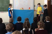Сегодня в 1 А и 1 Б классах на уроке татарской литературы ( учителя Даминова М.Р. и Галиуллина М.Н.) учащиеся 5 класса с учителем татарского языка Лизуниной Э.Х. показали кукольный театр на татарском языке. Первоклассники с интересом смотрели театральную постановку, а после просмотра отвечали на вопросы по содержанию сказки. В конце посмотрели мультфильм на татарском языке "Кто сказал мяу?"