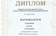 На республиканском этапе Всероссийской олимпиады школьников по астрономии успешно выступил ученик 9 класса МБОУ Затонская СОШ Ларионов Игорь, занявший 3-е место в рейтинге среди девятых классов. Ему был вручён диплом призёра регионального этапа Всероссийской олимпиады по астрономии. За подготовку призёра Почётной грамотой МОиНРТ награждена Елагина Л.Ф.