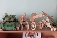 Большинство моделей военной техники поражают обилием мелких деталей, выточенных из дерева, таких как: винты самолетов, мачты кораблей, дула стрелкового орудия, салазки вертолета. Некоторые элементы выполнены выжиганием по дереву.