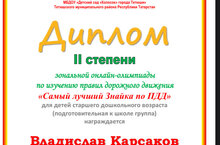 Дипломом 2 степени зональной онлайн-олимпиады по изучению правил дорожного движения "Самый лучший Знайка по ПДД" награждается воспитанник подготовительной группы Карсаков Владислав. Поздравляем!