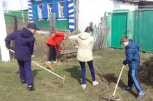 Ученики 7 б класса оказали помощь Муслиме апе в уборке территории вокруг дома .