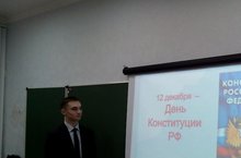 12 декабря в 9 а классе прошел классный час, посвященный Дню Конституции России. 12 декабря 1993 года в нашей стране впервые за её историю был принят принципиально новый Основной закон — такой Закон, который признал высшей ценностью человека, его права и свободы, который установил основы демократического порядка России и обязавший государство на деле соблюдать и защищать эти новые базовые ценности.