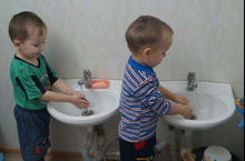- Смыть мыло под струей воды, побуждая малыша к самостоятельным действиям.