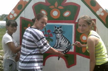 Сегодня учащиеся 10 класса во время летней практики оформляли территорию школы. Теперь на клумбах появились интересные сказочные фигуры.