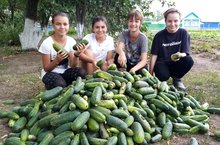 На пришкольном участке выращенбогатый урожай огурцов, помидоров и других культур.