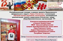 Сегодня школа отправила материал на участие в Республиканском конкурсе в рамках проекта Приволжского федерального округа «Герои Отечества» в номинации «Лучший музей (музейная экспозиция), посвящённый увековечению памяти защитников Отечества» среди общеобразовательных организаций РТ.
