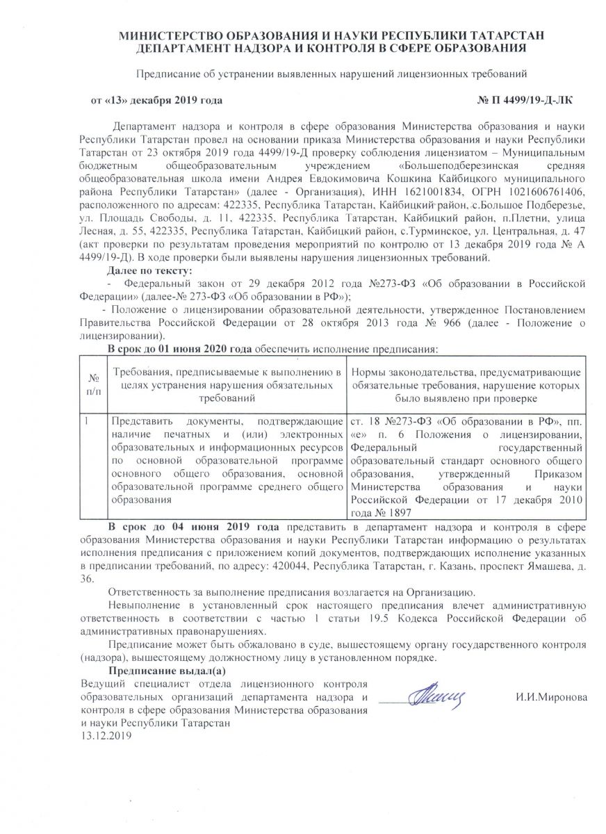Предписание об устранении выявленных нарушений лицензионных требований