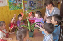 Балалар гөлләр яраталар, алар тәрбияче апалары белән бергәләп бүлмә гөлләрен үстерү серләренә төшенәләр.