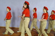 Сегодня в школе в смотре приняли участие пять команд. Одна из них – это учащиеся 6 класса сразу выделялись из других команд. Команды соревновались в построении, ходьбе строевым шагом, выполняли строевые задачи (повороты налево, направо и кругом), в завершении смотра ребята прошли со строевой песней. Оценивались: строевой шаг, построение, сдача рапорта командиром, прохождение с песней.