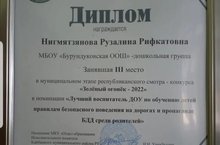 Воспитатель дошкольной группы Нигмятзянова Р. Р. заняла 3-место в конкурсе "Зеленый огонек и награждена Дипломом и ценным подарком.