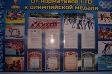 В школе оформлен стенд по ГТО. Стенд содержит план мероприятий спортивно массовой работы на учебный год, нормативы комплекса ГТО и результаты спортивных достижений учащихся и школы.