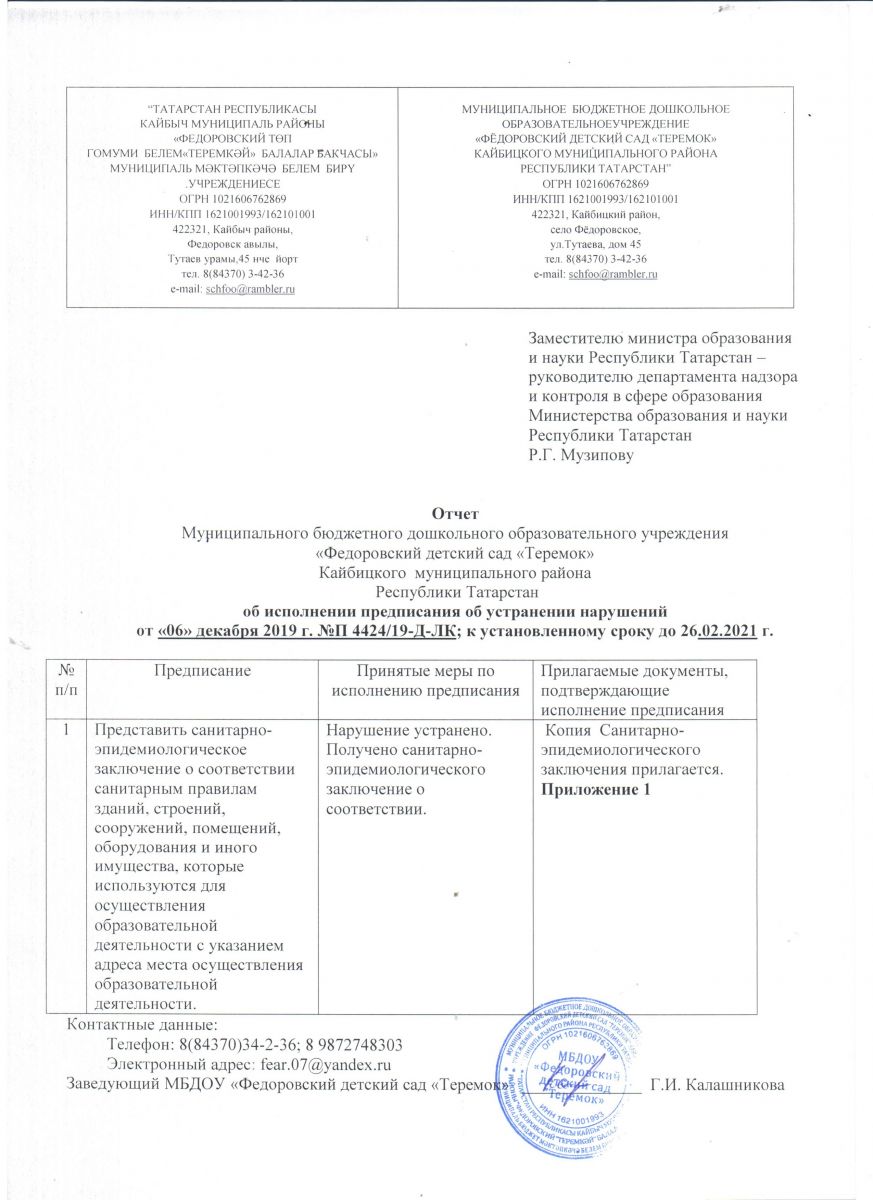 Отчет о выполнении предписания об устранении нарушений № П 4424-19-Д-ЛК
