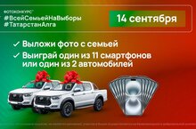14 сентября, в день проведения выборов Раиса Татарстана и муниципальных депутатов пройдет фотоконкурс #ТатарстанАлга #ВсейСемьейНаВыборы. По его итогам можно выиграть автомобиль или смартфон