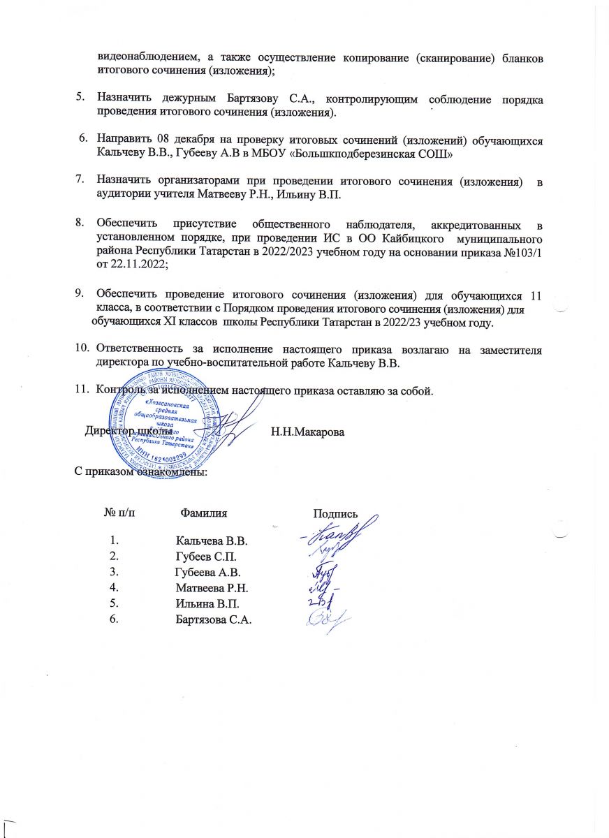 Приказ о проведении итогового сочинения (изложения) для обучающихся 11 класса (лист 2)