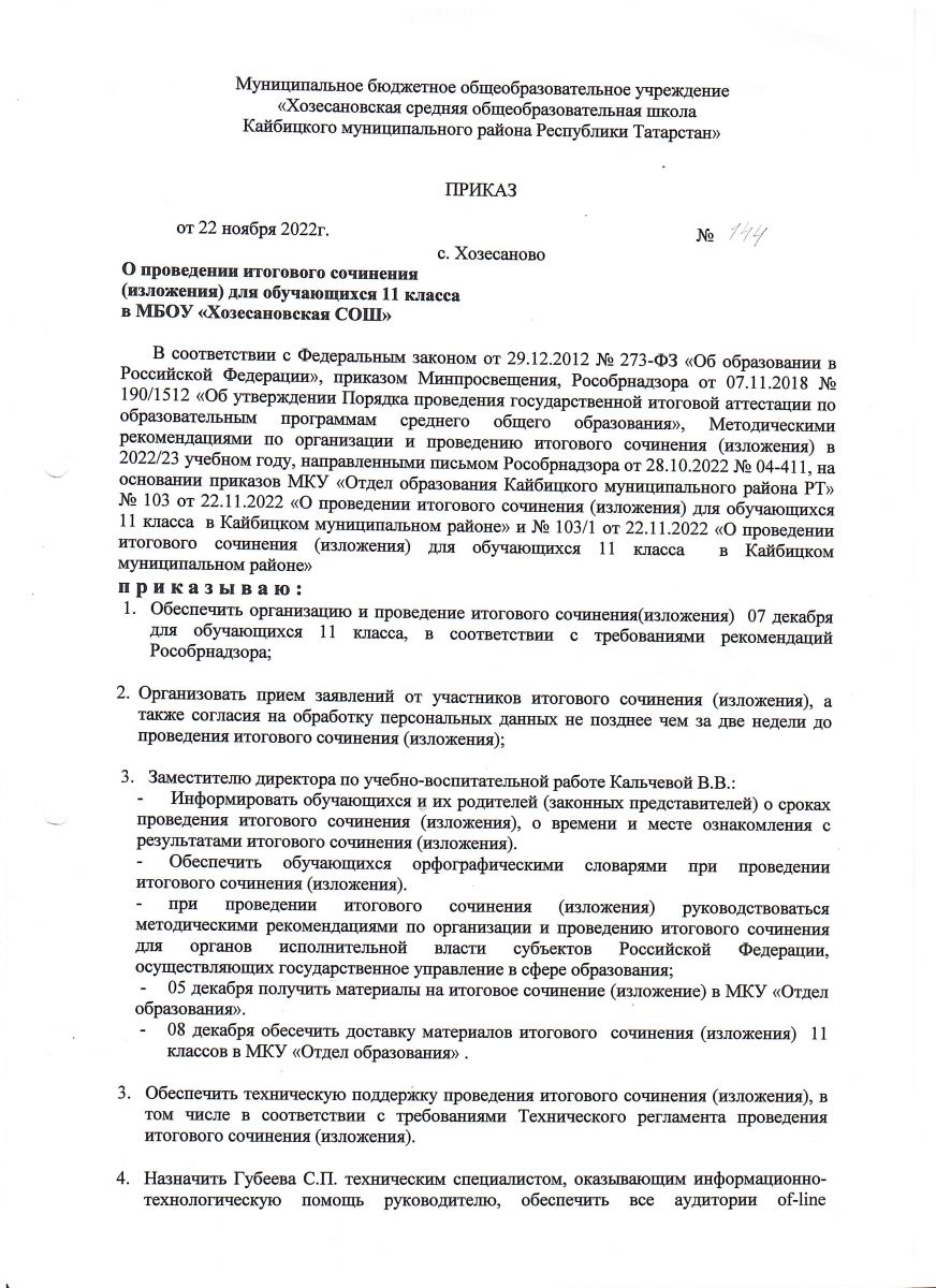 Приказ о проведении итогового сочинения (изложения) для обучающихся 11 класса (лист 1)