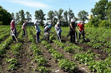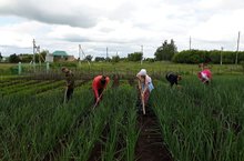 Мәктәп яны кишәрлегендә эш гөрли: җәйге практика үтүче укучылар бәрәңге чүбен утауның икенче катын төгәлләделәр бүген.