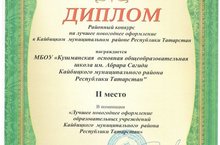 Кайбыч районы белем бирү учреждениеләре арасында үткән "Яңа елга әзерлек" буенча конкурста безнең мәктәп II нче урынга лаек булды! Әлеге уңышка ирешүдә барлык укучыларның, укытучыларның, мәктәп хезмәткәрләренең һәм әти-әниләрнең өлеше зур. Барчагызга да зур рәхмәтебезне белдерәбез!