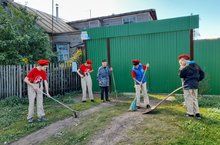 Бүген мәктәбебез юнармиячеләре “Көзге мәрхәмәтлелек” атнасы кысаларында Бөек Ватан сугышы ветераны Зиганшин Хәсән абый янында кунакта булдылар. Ветеранның капка яннарын җыештырдылар, чүпләрдән арындырдылар.