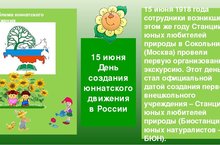 Днем создания юннатского движения считается 15 июня 1918 года, когда сотрудники возникшей в том же году Станции юных любителей природы в Сокольниках (Москва) провели первую организованную экскурсию. Этот день стал официальной датой создания первого внешкольного учреждения – Станции юных любителей природы (или Биостанции юных натуралистов – БЮН).Через год при станции уже действовало четыре кружка: «Огородники» (ботаники), «Птичники» (орнитологи), «Насекомники» (энтомологи), «Водолюбы» (гидробиологи). Позднее она сменила название и стала Центральной биостанцией юных натуралистов имени Тимирязева. Именно здесь зародилось юннатское движение страны. -