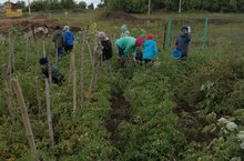 Мәктәп бакчасында эшләргә чират беренче сыйныфларга җитте.Укучылар кыяр,кабачки җыялар.Менә бүген алар укытучылары Динә апалары белән помидор җыйдылар.