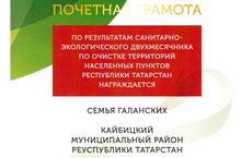 Победитель конкурса "ЭКОВЕСНА 2017" 04.07.2017 Ученица 2 класса Галанская А. вместе со своим классным руководителем Самарской Т.И. участвовали в конкурсе "ЭКОВЕСНА 2017". И семья Галанских по результатам санитарно-экологического двухмесячника по очистке территорий населенных пунктов РТ удостоилась ПОЧЕТНОЙ ГРАМОТЫ, стала победителем конкурса "ЭКОВЕСНА 2017" в номинации "ЭКОСЕМЬЯ"
