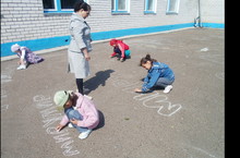 Дети склонились над асфальтом, веселочто-то обсуждают, меняются мелками. и вот на асфальте появилось огромное солнце, надпись "Миру-мир" и другие забавные яркие рисунки.