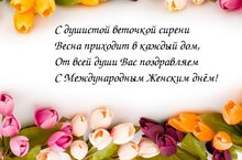 Сердечно поздравляем Вас с самым красивым и светлым весенним праздником - днем 8 Марта! ... Примите самые искренние поздравления с чудесным весенним праздником – Международным женским днём 8 марта!