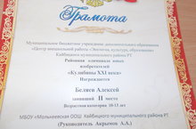 2 марта состоялась районная олимпиада изобретателей "Кулибины 21 века". Наш ученик Беляев Алексей занял 2 место, в возрастной категории 10-13 лет. Руководитель Акрымов Артур А.