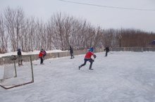 Не зря поётся в песне «Трус не играет в хоккей». Не смотря на мороз ребята каждый день играют в хоккей на нашей школьной площадке. До обеда каток занят пришкольным лагерем, а после обеда на каток приходят ребята постарше.