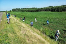 Учительский коллектив и парни 9 класса вышли на обкашивание обочин дороги.