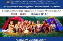 В соответствии с планом работы Министерства образования и науки Республики Татарстан 8 июня 2018 года в 10:30 состоится заседание Республиканского родительского интернет-собрания на тему: «Каникулы с пользой». На повестке дня планируется рассмотрение вопросов организации летнего отдыха детей в 2018 году.Онлайн-трансляция собрания организуется на сайте Казанского инновационного университета имени В.Г.Тимирясова по адресу: http://киу.рф/. Предварительная регистрация для просмотра интернет-собрания не требуется. В процессе трансляции будут даны ответы на наиболее интересные вопросы, направленные ранее. Вопросы принимаются по адресу электронной почты: roditelirt@mail.ru/.