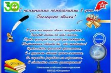 Вот и отзвенел последний школьный звонок! Мы поздравляем вас с окончанием школы. Детство остается за ее порогом, вы вступаете во взрослую жизнь. Сколько всего пронеслось за эти годы: радость от первых побед, упорный труд над собой, бессонные ночи родителей. Помните, какими были ваши первые неумелые шаги в учебе, первые написанные буквы, прочитанные слова? Всё это далеко позади. Впереди у каждого свой путь. Каждый из вас, наверняка, определился с выбором профессии. Теперь все решения вы будете принимать самостоятельно. И только от вас зависит то, как сложится ваша дальнейшая судьба. Легких вам начинаний, удачных свершений, светлого будущего!