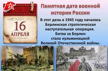 16 апреля – памятная дата военной истории России. В этот день, 16 апреля 1945 года, началась Берлинская наступательная операция, которая закончилась 2 мая 1945-го. Части 1-го и 2-го Белорусского, а также 1-го Украинского фронтов в течении 17 дней на фронте протяженностью в 300 км продвинулись с востока на запад по территории Германии от 100 до 200 километров, преодолевая сопротивление миллионной группировки вермахта.