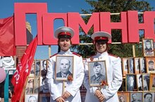На площади перед мемориальным комплексом строевым маршем прошли победители и призеры районного конкурса строя и песни - учащиеся Большекайбицкой школы: члены военно-патритотического клуба «Подвиг», учащиеся восьмых и шестого классов.