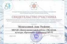 26 ноября 2022г. на прошёл Республиканский круглый стол по обмену передовым педагогическим опытом "Специфика проведения массовых мерприятий и соревнований технической направленности для детей - инвалидов и детей с ограниченными возможностями здоровья в системе дополнительного образования.Приняла участие методист по базовой площадке МБУ ДО ЦВР "ЭКО" Мутыгуллина Алия Рауфона и получила свидетельство участника.