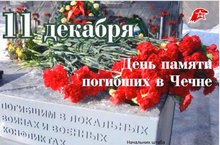 11 декабря - День памяти погибших в вооружённом конфликте в Чечне. 11 декабря - День памяти погибших в вооружённом конфликте в Чечне. По всей стране проходят панихиды по погибшим, а также уроки мужества, классные часы, выставки и экспозиции. Во всех отрядах МО ВВПОД "Юнармия" пройдут мероприяти в помять погибших в Чечне.