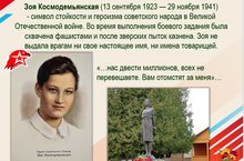 Юнармейцы отряда имени кавалера ордена Красной Звезды В.М.Драндрова провели урок Мужества, посвященный Зое Анатольевне Космодемьянской. Женщина-красноармеец диверсионно-разведывательной группы штаба Западного фронта, заброшенная в 1941 году в немецкий тыл. Первая женщина, удостоенная звания Героя Советского Союза во время Великой Отечественной войны. Она является героем отряда. Юнармейцы чьтят ее память и берут с нее пример. 29 ноября 1941 г. фашисты ее казнили в деревня Петрищево, Московскай области. Вечная память героям.