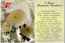 Уважаемые представители старшего поколения, сердечно поздравляем вас с Международным днём пожилых людей! Хотим пожелать вам полнокровной, счастливой и беззаботной жизни на склоне лет в окружении заботливых детей и внуков. Пусть не прерывается связь между зрелостью и юностью, пусть ваша мудрость и бесценный жизненный опыт помогают молодёжи жить в мире и согласии, воспитывать чувства отзывчивости и человеколюбия при построении прогрессивных отношений в современном обществе. Примите слова благодарности за вашу стойкость, терпение и самоотверженный труд.