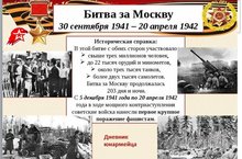 80 лет назад в ходе Великой Отечественной войны началась битва за Москву. Боевые действия советских и немецких войск на московском направлении. Делится на 2 периода: оборонительный и наступательный, который состоит из двух этапов: контрнаступления и наступления советских войск. В западной историографии битва известна как «Операция Тайфун».