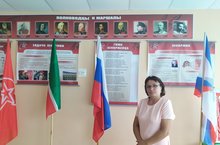 На фото координатор отряда МО ВВПОД "Юнармия" отряда имени кавалера ордена Красной Звезды " Чутеевская ООШ" - Гелюся Гаряфутдиновна в комнате юнармейца.