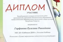 Преподаватель отделения "Фортепиано" и теоретических дисциплин Гирфанова Русалина Рашидовна приняла участие в Республиканском конкурсе методических работ преподавателей учреждений дополнительного образования и профессиональных образовательных организаций в сфере культуры Республики Татарстан с авторским переложением для оркестра «Звуки вальса» в номинации "Лучшее переложение педагогического репертуара" и награждена Дипломом участника. Желаем дальнейших успехов, новых идей и побед!