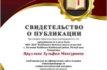 Преподаватель нашей школы отделения «Народные инструменты (баян)» Яруллина Зульфия Мансуровна опубликовала на официальном сайте издания "Альманах педагога" учебно-методический материал : Учебная программа по теме: «Ансамбль» по дополнительной предпрофессиональной программе в области музыкального искусства «Народные инструменты» . За публикацию ей вручили Свидетельство ( от 07.12.2017г.). Желаем Зульфие Мансуровне дальнейших творческих успехов в работе!