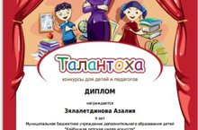 Ученицы вокального отделения Тараканова Марина и Зялалетдинова Азалия приняли участие во Всероссийском творческом конкурсе "Талантоха" в номинациях: "Вокальное и музыкальное творчество", руководитель: Тлепова Розалья Акрамутдиновна. Тараканова Марина исполнила народную песню крещенных татар "Спндугач", а Зялалетдинова Азалия исполнила песню на стихи Р.Миннуллина , муз.М.Шамсутдинова "Әни кирәк". Обе ученицы удостоились Дипломами Победителя за 1 место. Пожелаем им успеха и новых побед!