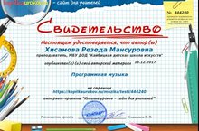 Преподаватель отделения "Фортепиано" Хисамова Резеда Мансуровна опубликовала свой авторский материал "Программная музыка" на сайте интернет - проекта "Копилка уроков - сайт для учителей". Ей вручили свидетельство о публикации, с чем ее и поздравляем.