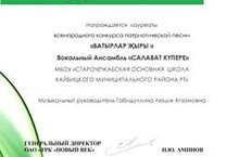 Тагын бер конкурстагы җиңүебезнең дипломы килеп җитте. Монысының геройлары - "Салават күпере" вокаль ансамбле кызлары. "Батырлар җыры" бөтенхалык патриотик җырлар бәйгесен "Яңа гасыр" телевидениесе белән берлектә "Болгар радиосы" үткәргән иде. Составында "ТНВ- Яңа гасыр" телевидениесе җитәкчеләре, Миңгол Галиев кебек мәртәбәле шәхесләр булган жюри укучыларыбызның чыгышын яратып кабул итте. Кызларыбыз башкаруындагы "Балалар тавышы" җыры радио дулкыннарыннан да еш яңгырап торды.