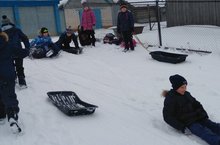 Учащиеся начальных классов сегодня после уроков с удовольствием катались на санках с горы.
