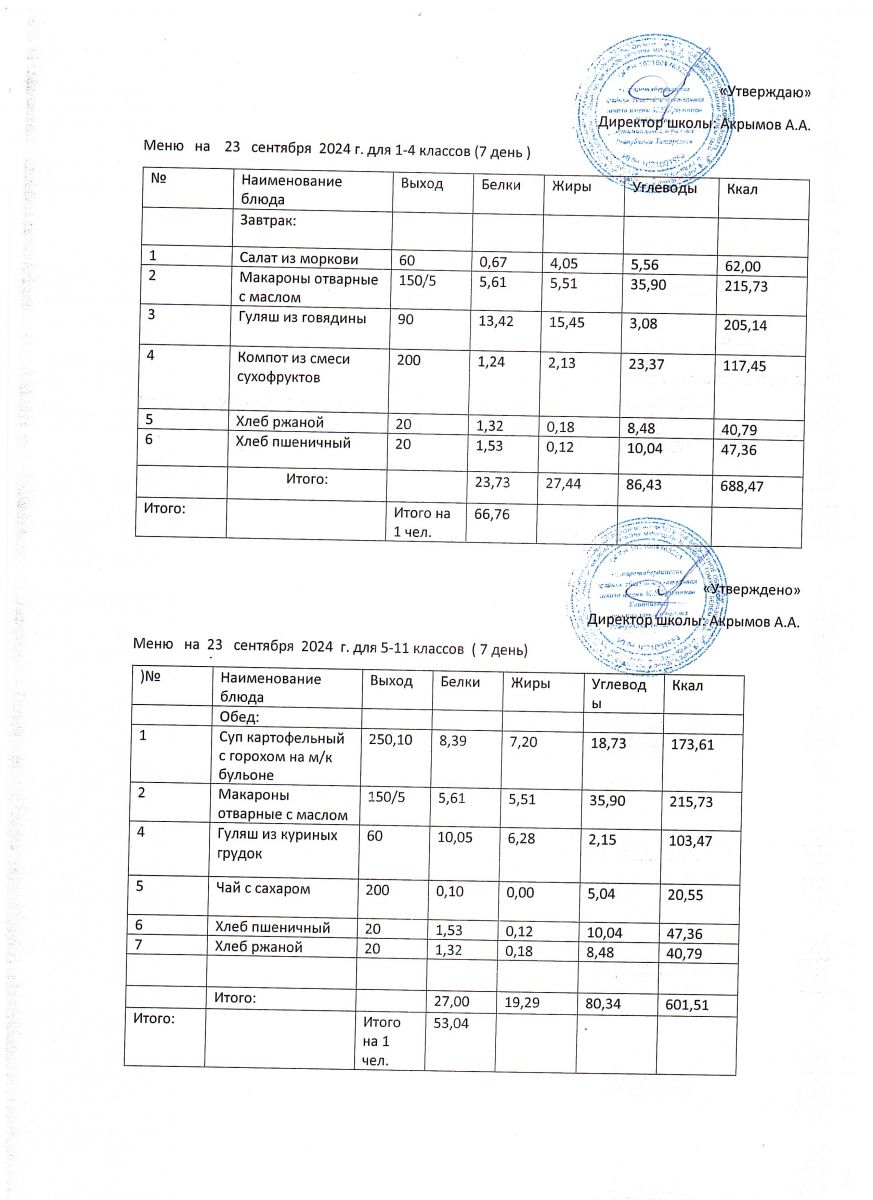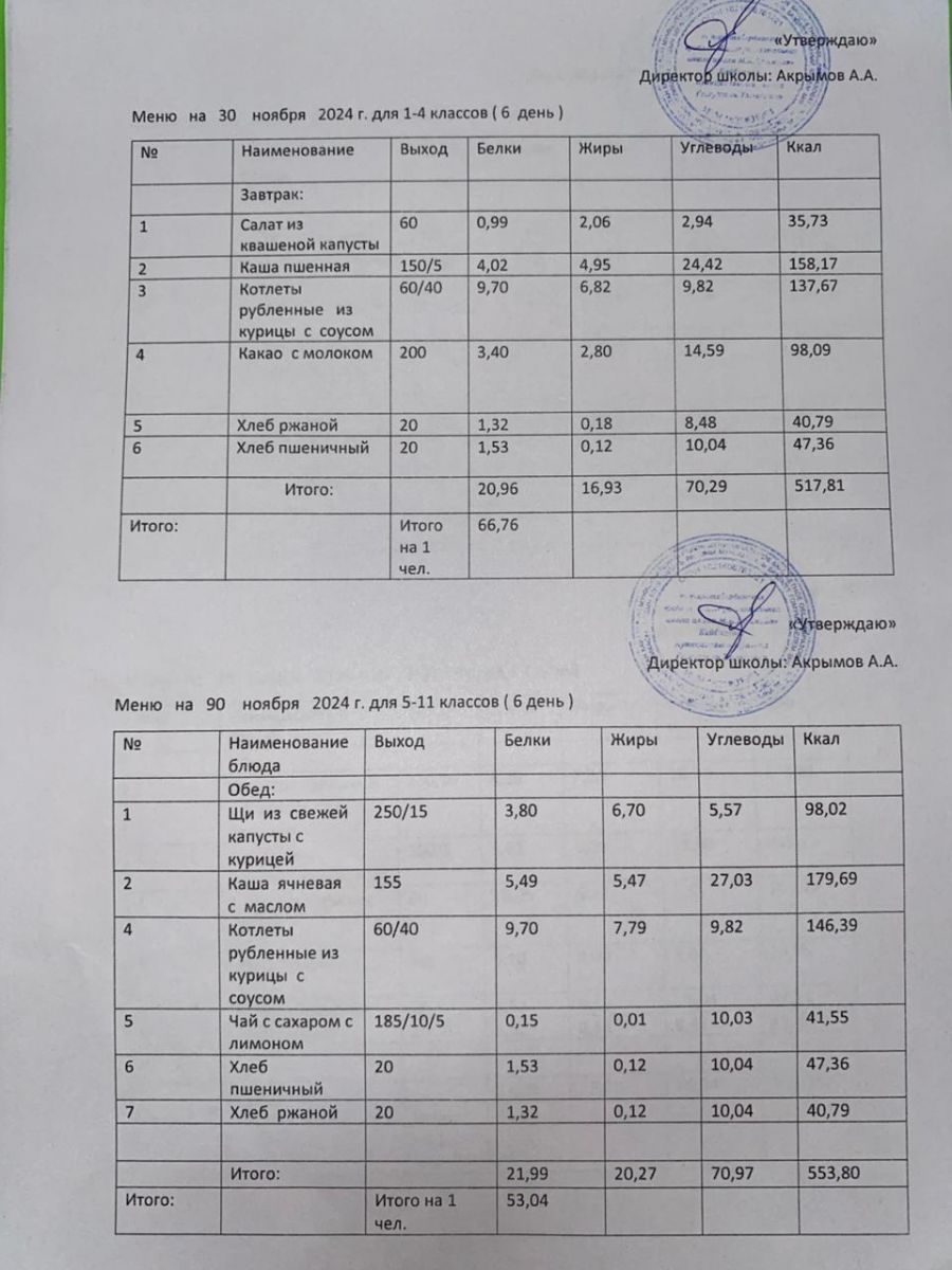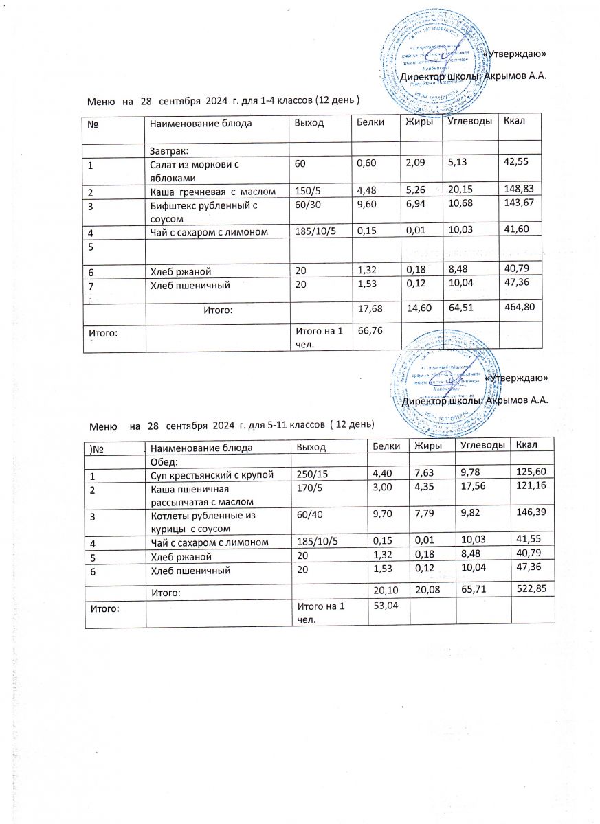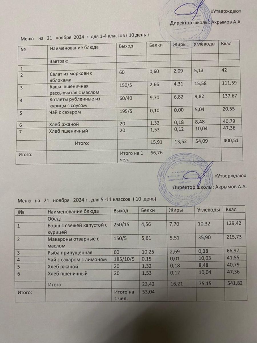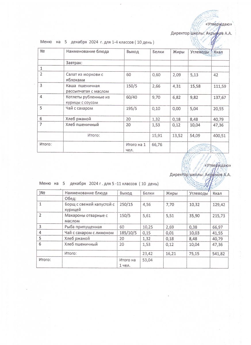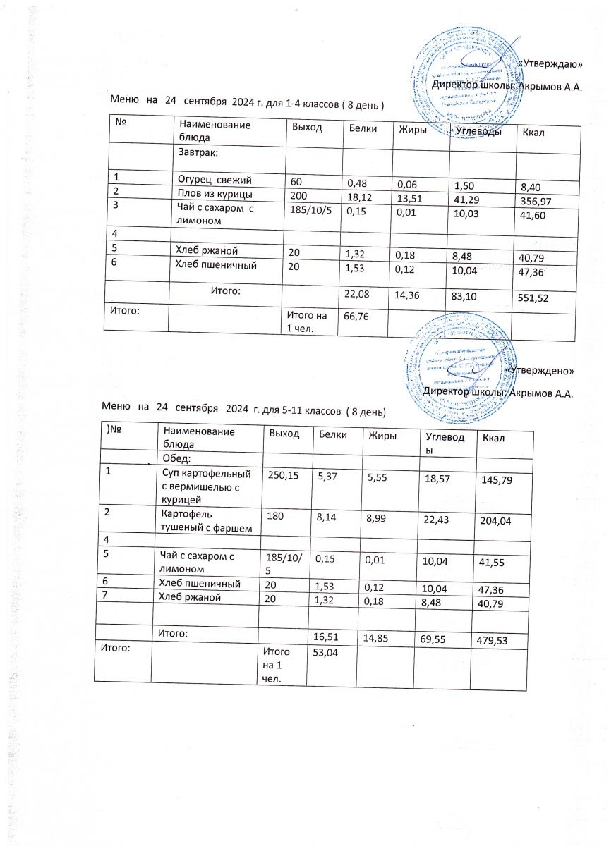 Ежедневное меню учащихся 1-4, 5-11 классов на 2024-2025 уч.год